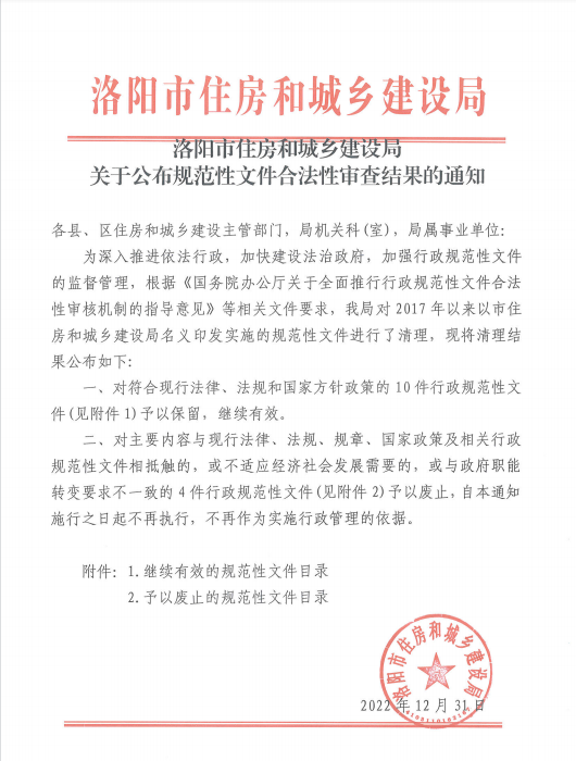 洛阳市住房和城乡建设局关于公布规范性文件合法性审查结果的通知